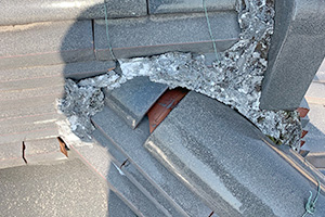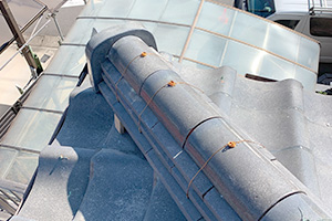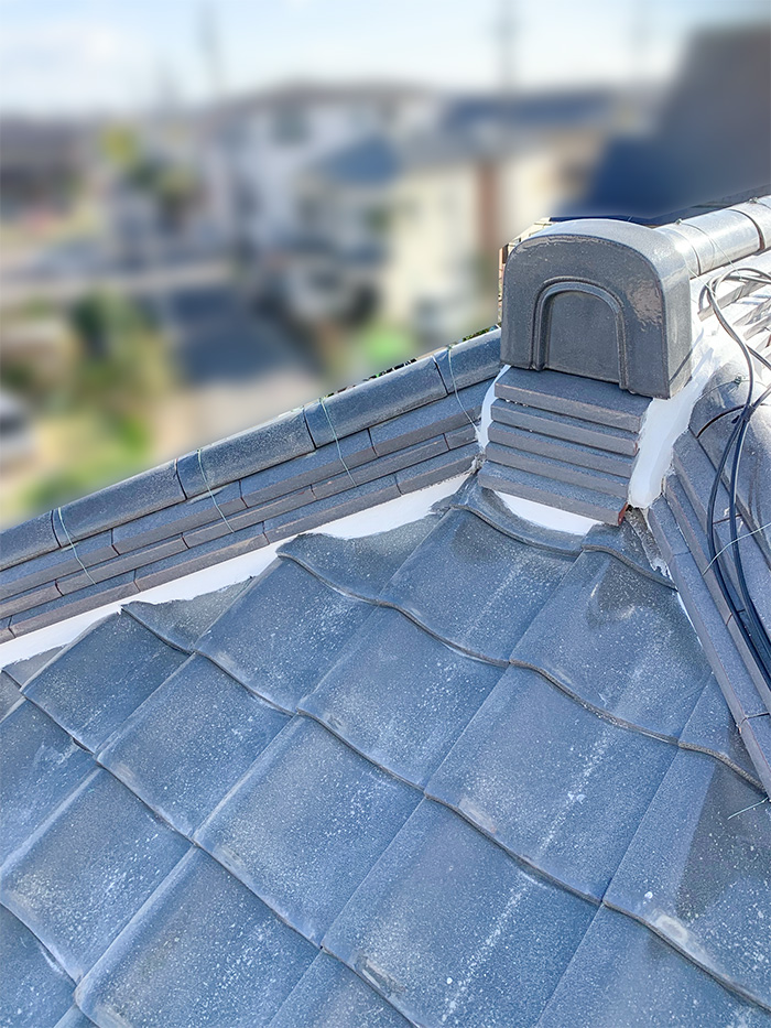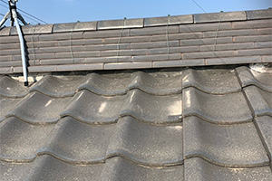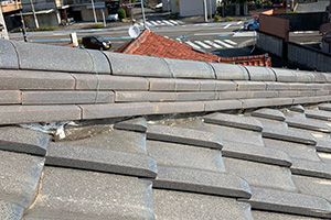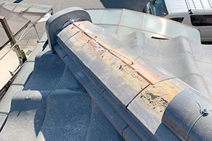 隅棟鬼が傾いている場合棟丸瓦がずれている場合が多く今回棟接続部に大きく瓦ずれがありました。