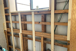 窓枠周辺に漏水痕が見受けられたので壁下地を捲り、漏水箇所の修繕も行うプランで施工を行いました。